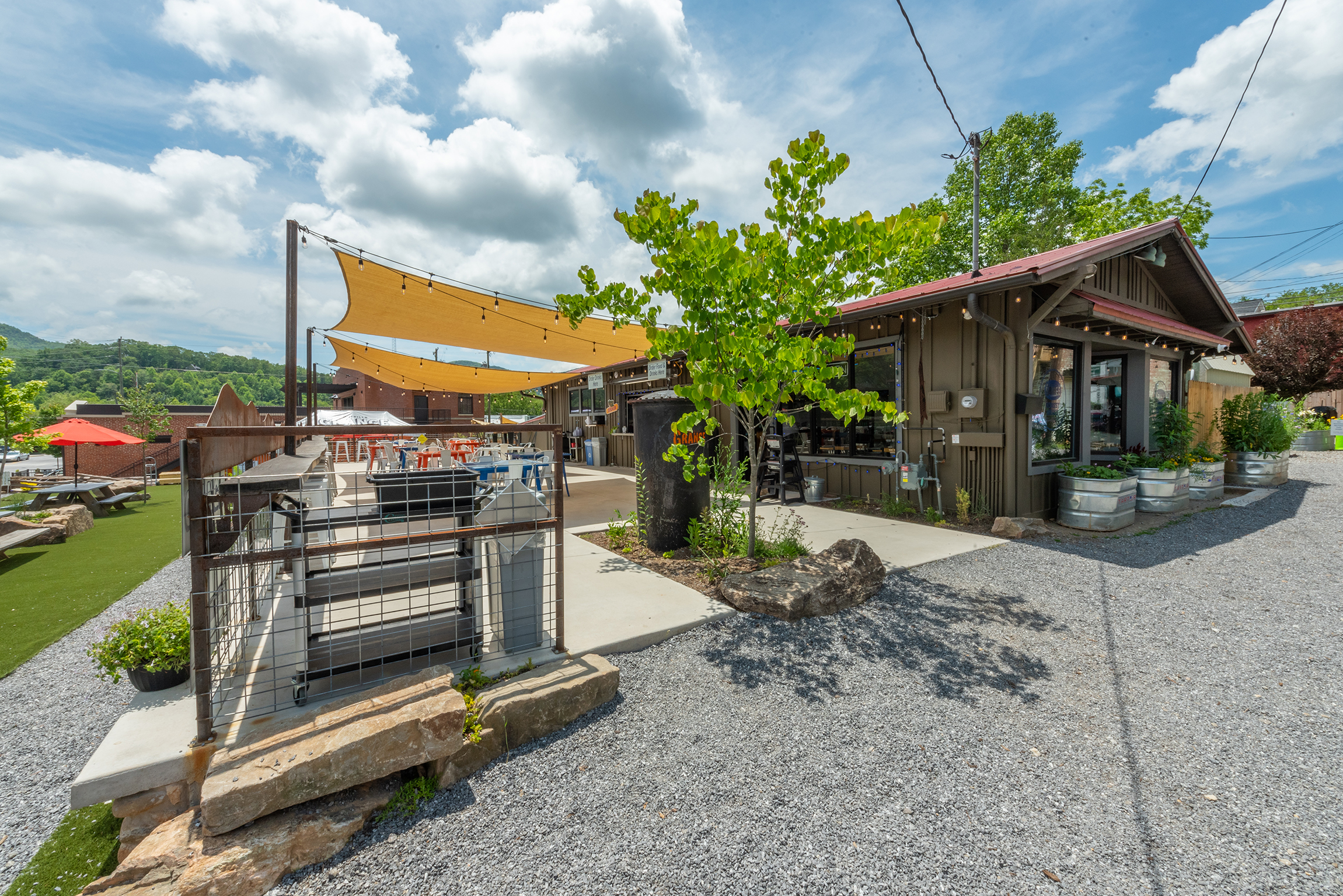 Foothills Grange offers ample outdoor seating with mountain views.