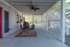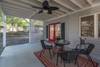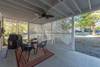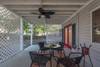 • Covered patio with ceiling fan, outdoor dining, and gas grill