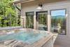 • Main floor primary bedroom with king-size bed, 45" Roku TV, en suite bathroom with walk-in shower, and access to the hot tub deck.