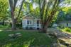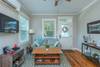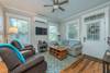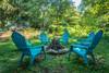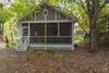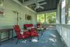 • Large screened-in porch with ample seating, overlooking the shaded backyard, fire pit, and patio with gas grill